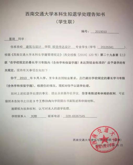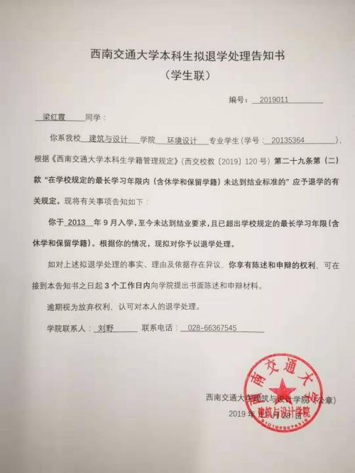 根据《新葡的京集团35222vip本科生学籍管理规定》第二十九条第(二)款 “在公司规定的最长学习年限内(含休学和保留学籍)未达到结业标准的” 应予退学的有关规定,拟对下列同学进行退学处理,因公司无法与本人取得联系,用其他方式也无法送达,特发布此公告,具体内容见附件。自本公告发出之日起满10日即视为送达,如果对上述拟退学处理有异议,可在公告期满3个工作日内向公司进行陈述和申辩。
