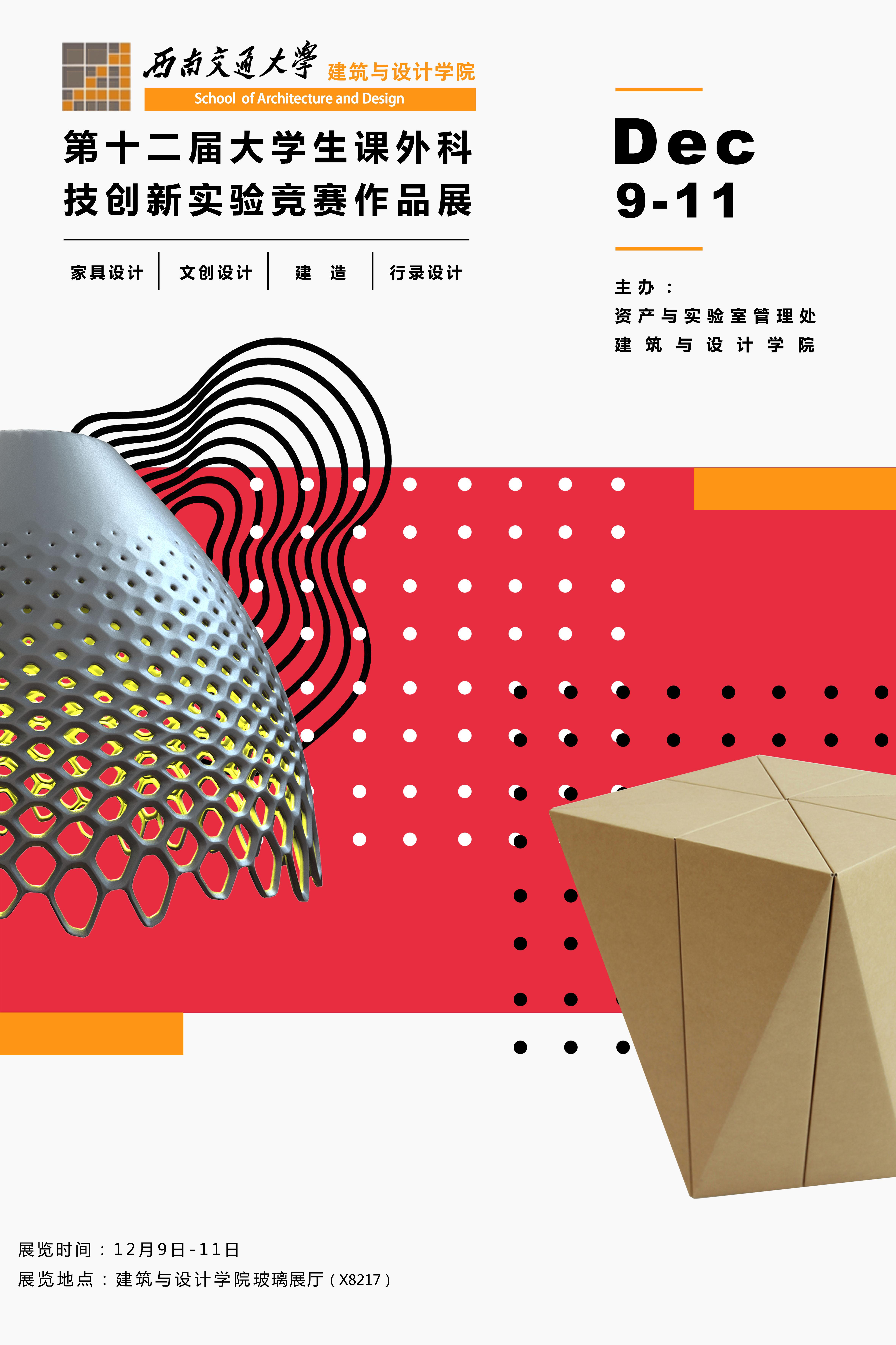 由资产与实验室管理处、建筑与设计公司主办的公司第十二届老员工课外科技创新实验竞赛即将落下帷幕。竞赛作品包括家具设计、文创设计、行录设计和建造类作品四大版块,于2020年12月9-11日在八教玻璃展厅(X8217)展出,欢迎老师同学们莅临观展。
