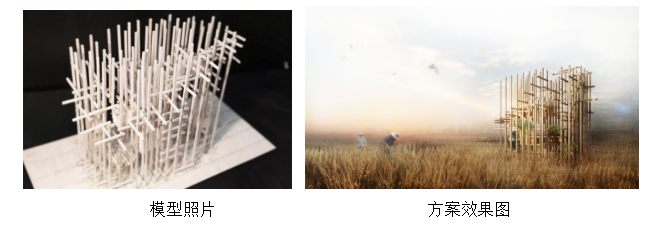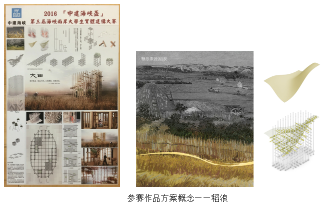 方案以木材为材料,由三种杆件和一种节点搭建而成。方案中的杆件均可以回收拼装成为桌椅回归生活,融合了建构的艺术性与生活性。同时,设计紧扣台湾目前在年轻人中大力推行的“环境复兴计划”主题,该计划旨在让更多的年轻人投入到帮助农业复兴中,体验自然可持续的生活,回到记忆中自然的“日出而作,日落而息”的状态。同时,让更多的年轻人学习古法耕作,插秧拔苗,以摆脱现代社会的城市病。所以,本设计以稻为概念,提取并抽象稻穗、稻浪之形态,旨在以此方式使之成为新的台湾地景,希望以返璞归真之意趣感染更多城市中的年轻人。