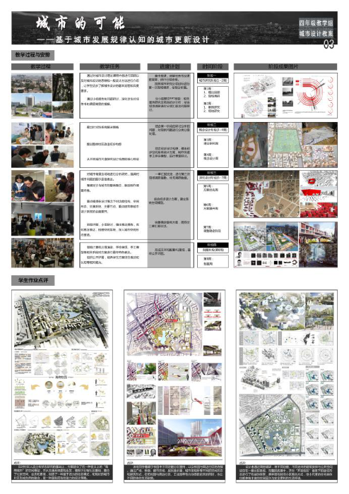 四年级城市设计单元,在设计立场上开始从个体主观喜好过渡到城市社会群体趋向,在设计尺度上从个体空间、群体空间过渡到城市的宏观考量;在设计方法上突出研究型设计的特点,强调调查分析、理论研究与空间设计的结合。课程教学围绕这三个方向展开,并设计相应的教学过程,强化技术手段的辅助,以建立员工对建筑与城市、行为与空间、社会与文化、效率与公平等一系列问题的初步认知。