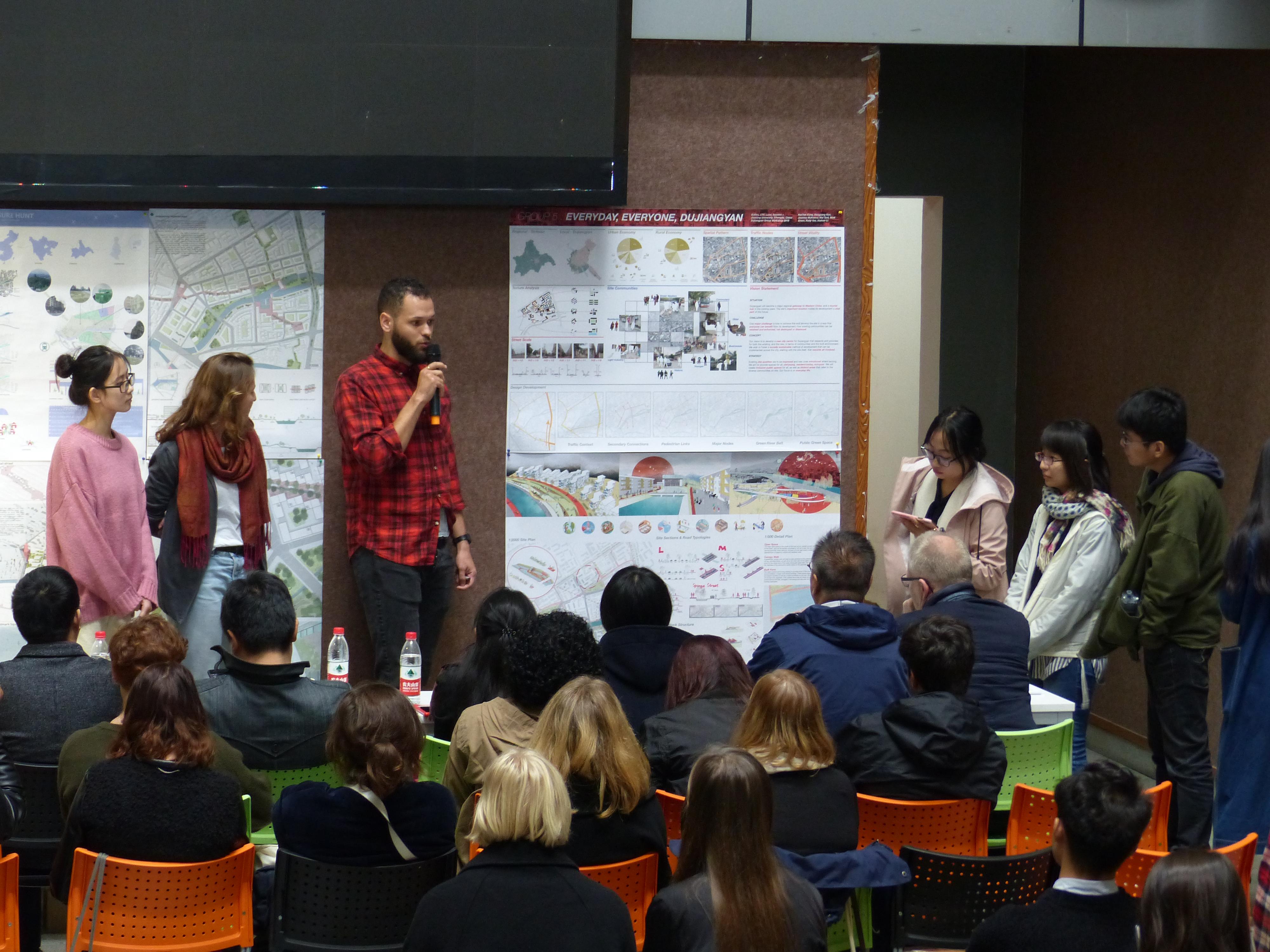 据悉,本次联合城市设计的选题位于都江堰市,北临蒲阳路,南临玉带桥街,西临建设路,东临观景路一段,基地内有蒲阳河自西向东穿过。项目选址西侧约1公里即为都江堰景区。参加活动的各位团队同学在前期准备和现场实地调研基础上经过一周的时间确定了设计概念并出图。10月19日进行最终评图环节。公司员工在本次活动中表现优异。