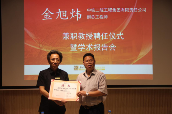 活动伊始,公司党委书记沈中伟介绍了金旭炜副总建筑师。金旭炜先生是现任中铁二院工程集团有限责任公司副总工程师,国家一级注册建筑师、教授级高级工程师。长期从事包括轨道交通、铁路等交通枢纽规划和建筑设计实践,曾参与完成成渝高铁、海南岛环线铁路、埃塞俄比亚亚吉铁路等数十项铁路项目的站房设计。沈书记表示,金教授在业界具有成绩斐然的卓越地位,故公司决定聘请金教授为公司兼职教授。