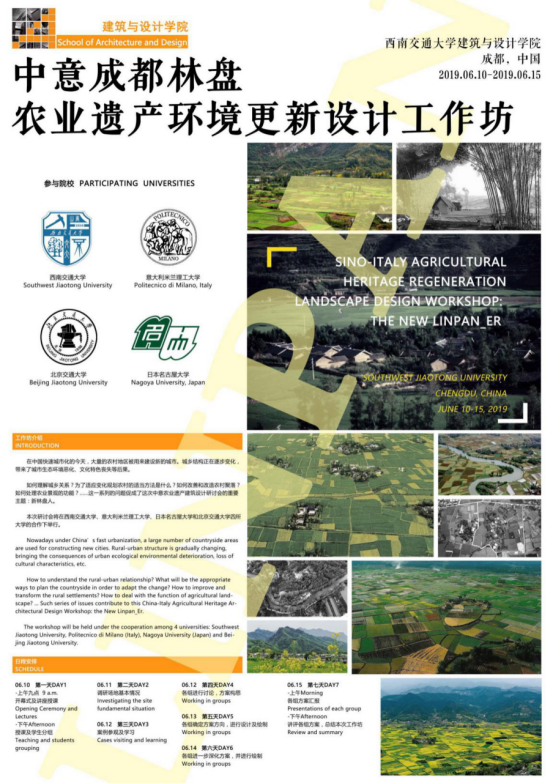 2019年6月10日-15日,中意成都林盘农业遗产环境更新设计工作坊由新葡的京集团35222vip与意大利米兰理工大学、日本名古屋大学和北京交通大学国内外四所优秀高校师生联合成功举办。该工作坊旨在探讨在乡村振兴背景下如何改善和提升林盘生活环境的合理方法,同时也是公司推进设计课程教学国际化的重要环节,促进多校师生相互交流学习。