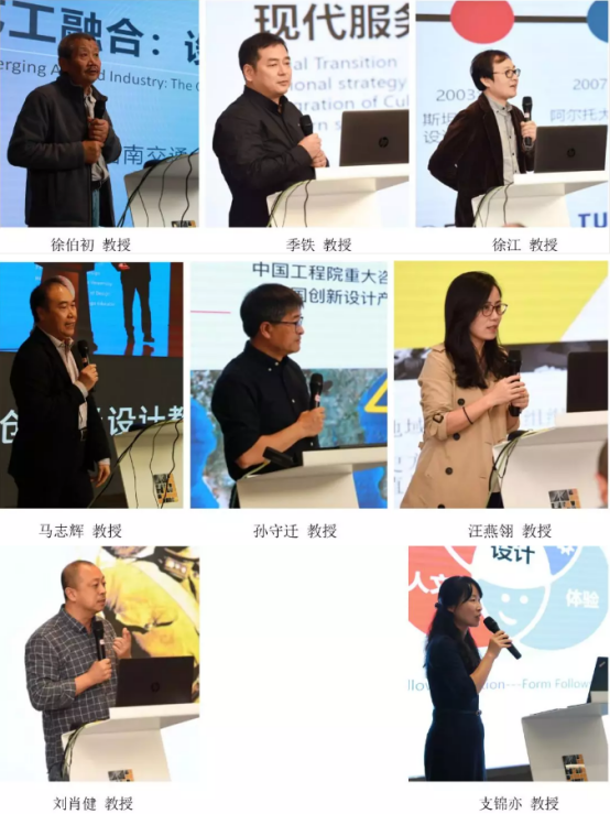 在17日下午的论坛活动中,徐伯初教授作了《艺工融合:设计专业建设与发展》主题研究报告,季铁教授作了《社会转型过程中的文化科技融合与设计生态》主题研究报告,徐江教授作了《中国设计的困境:行动中反思》主题研究报告,马志辉教授作了《设计教育与设计思维》主题研究报告,孙守迁教授作了《创新设计助力“一带一路”高质量发展》主题研究报告,汪燕翎教授作了《中国设计:全球化的昨日与今天》主题研究报告,刘肖健教授作了《原生态非遗保护与开发的需求与技术介入方式的思考》主题研究报告,支锦亦教授作了《“技术-人文-体验”面向智能化的交通装备创新设计》主题研究报告。(主题研究报告演讲嘉宾,图片按出场顺序排列)