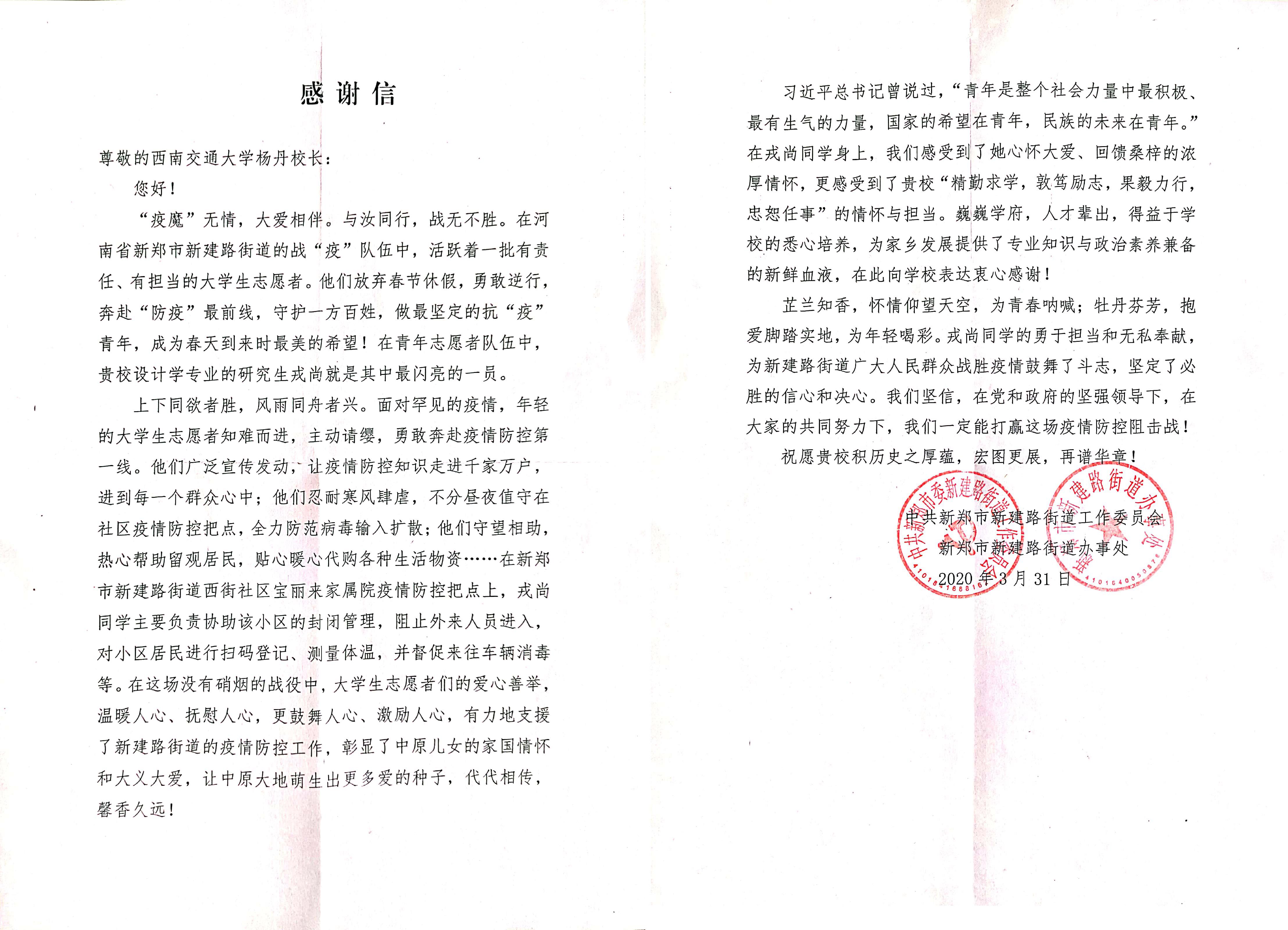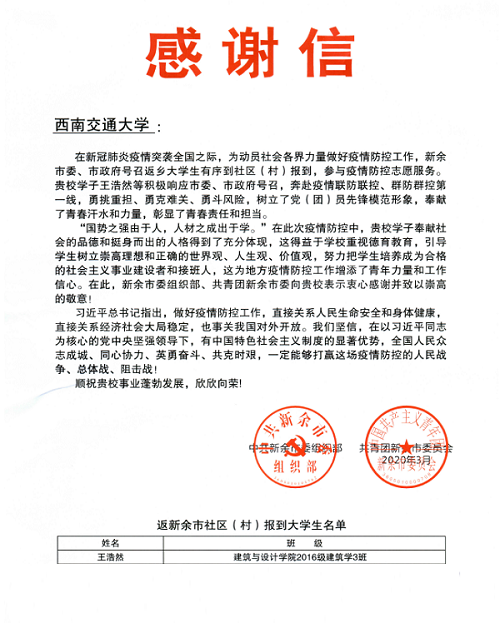 近日,新葡的京集团35222vip收到来自中共新余市委组织部和共青团新余市委员会的感谢信,来信中对建筑与设计公司2016级建筑学专业王浩然同学在新冠肺炎疫情防控志愿服务中的辛勤付出、对公司和学经理期以来对员工的教育培养表示感谢。