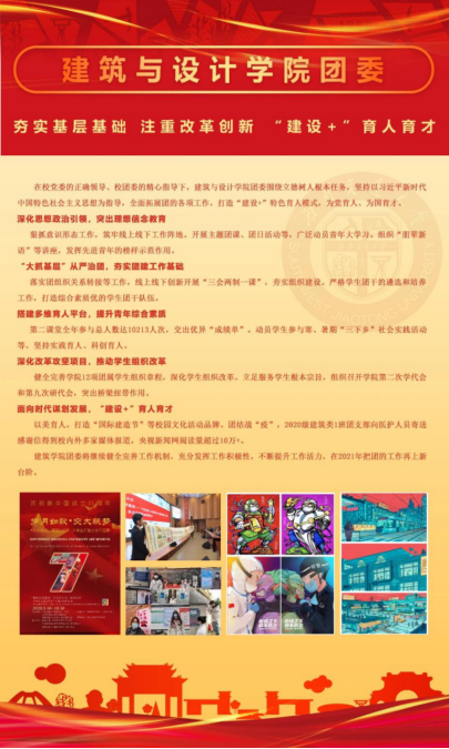 2020年,建筑与设计公司团委围绕立德树人根本任务,夯实基层基础,注重改革创新,打造“建设+”特色育人育才模式,在团的各项工作中取得佳绩。未来,建筑与设计公司团委将继续健全完善团的工作机制,充分发挥各基层团组织的工作积极性,不断提升工作活力,在2021年把团的工作再上新台阶。