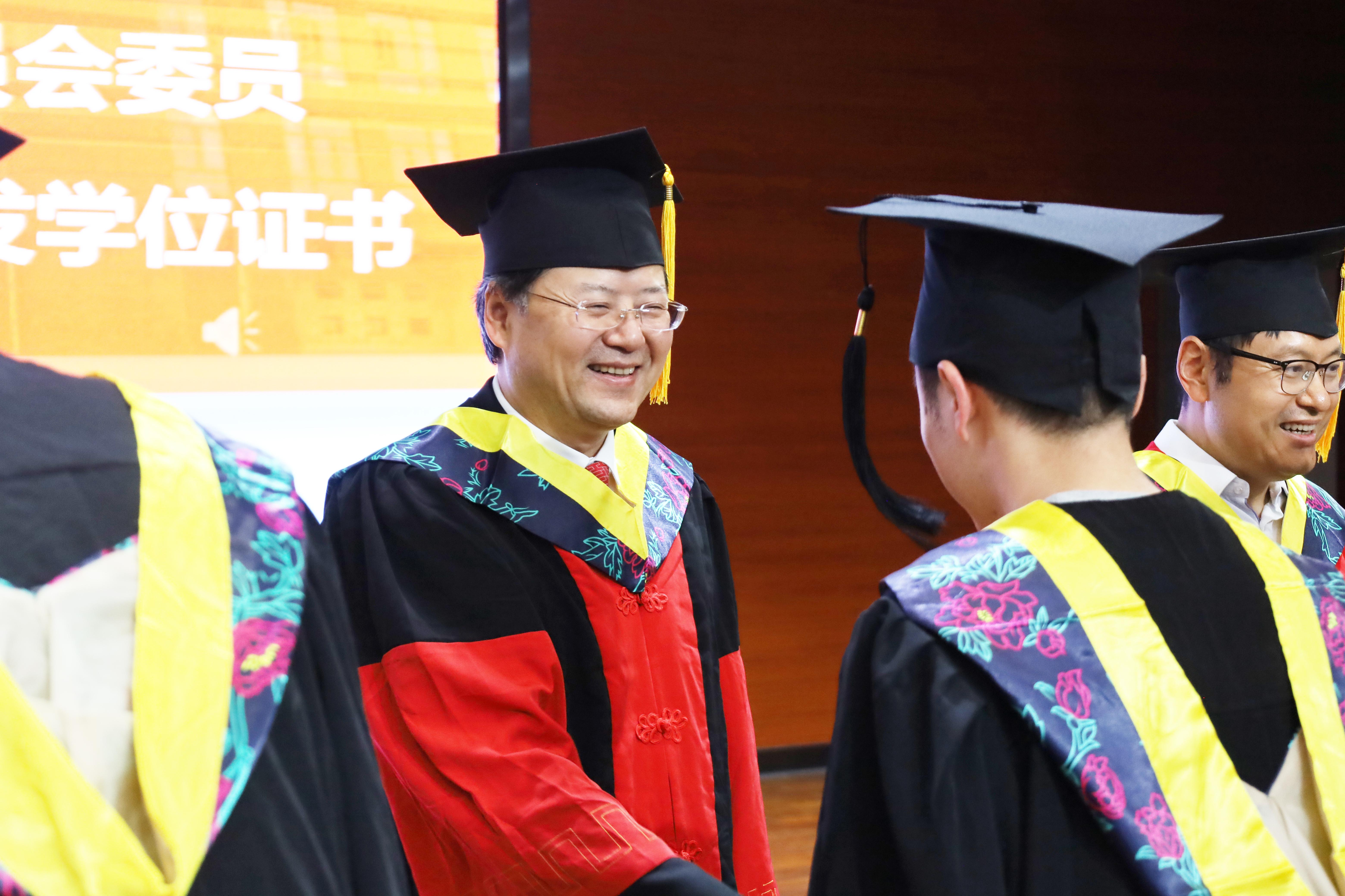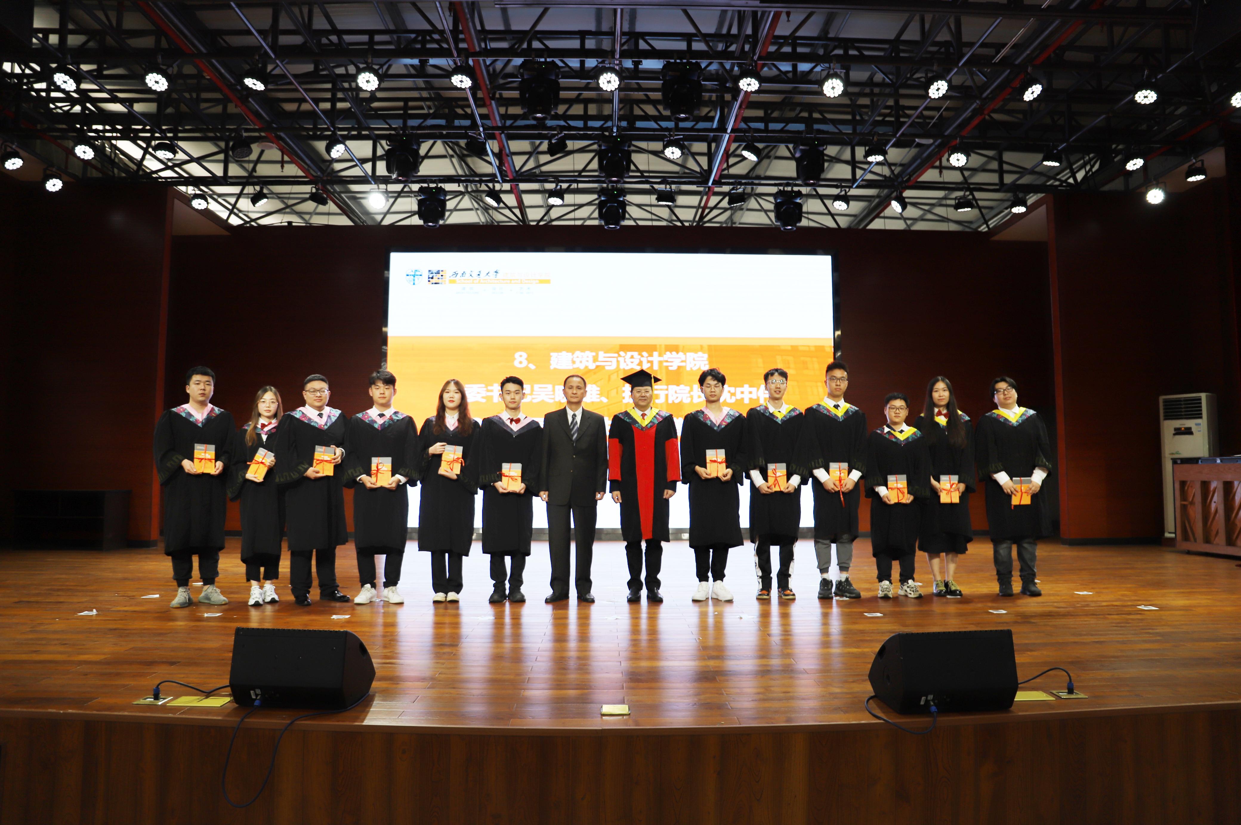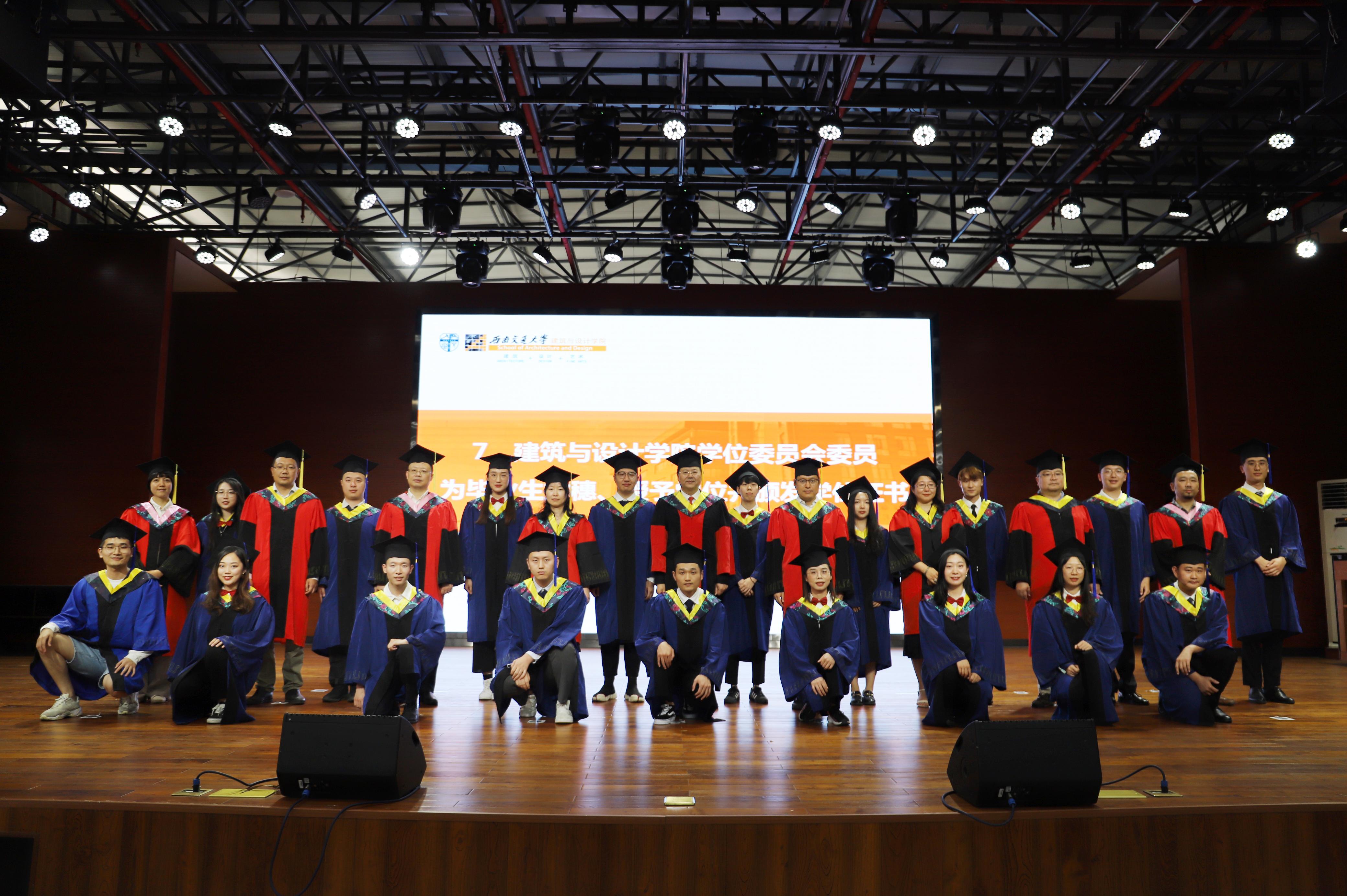 在高亢的音乐声中,建筑与设计公司学位委员为毕业生拨穗、授予学位,并合影留念,将典礼的气氛推向高潮。