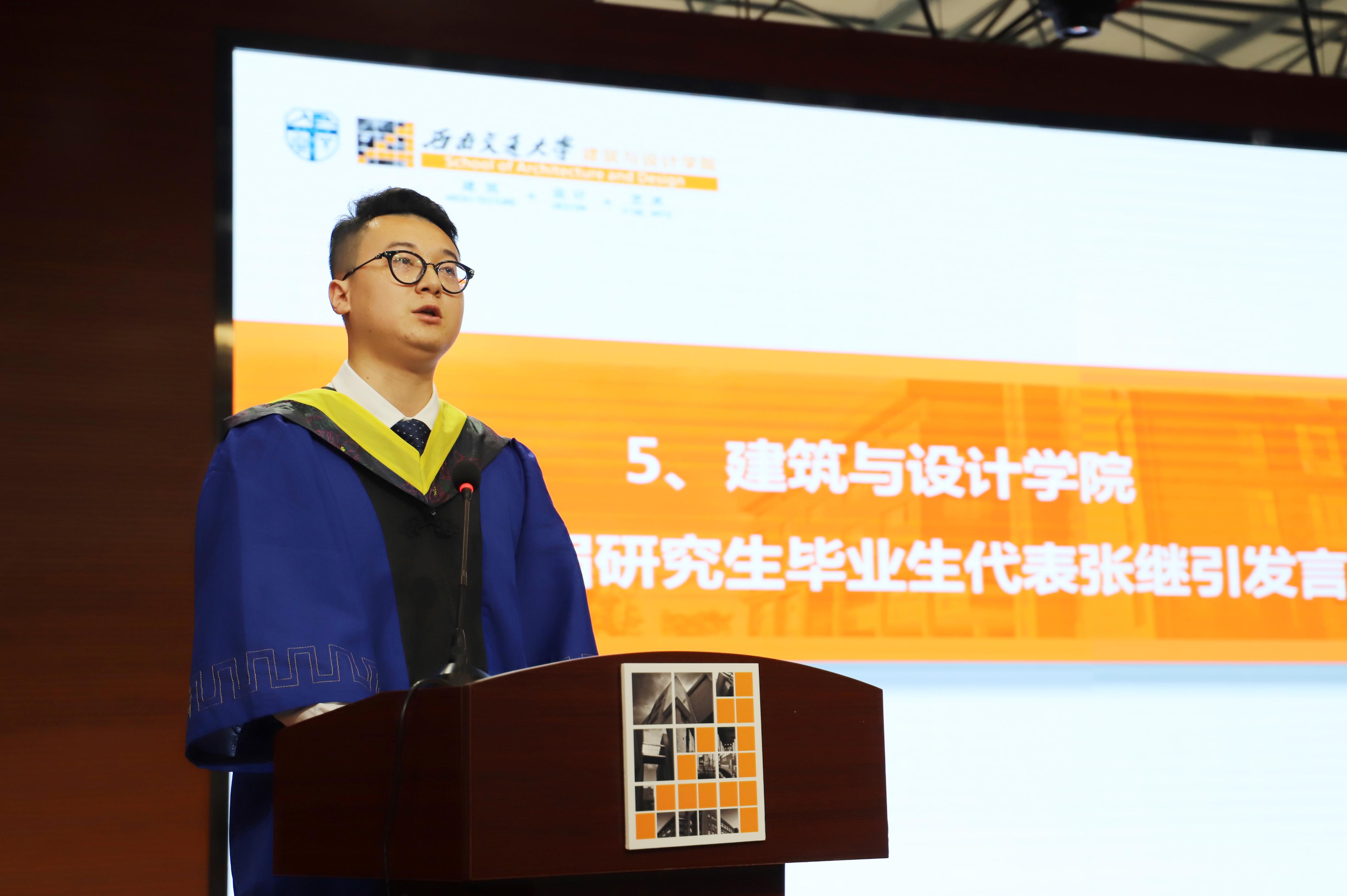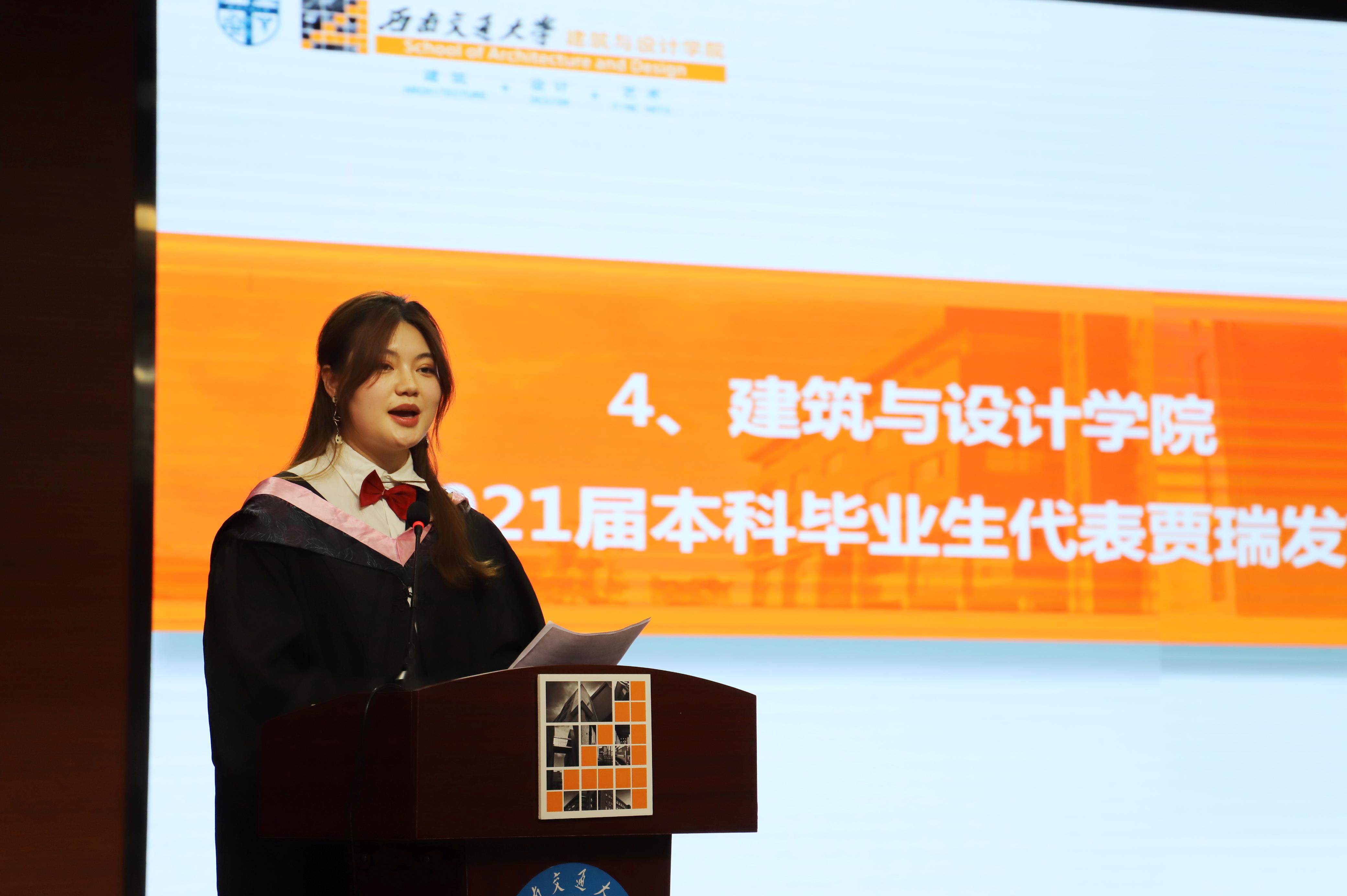 紧接着,建筑与设计公司2021届本科毕业生代表贾瑞和2021届研究生代表张继引发言。他们回顾了老员工活中刻骨铭心的记忆,感激母校和老师的培养,表示将会不负期望,努力成为母校的骄傲。