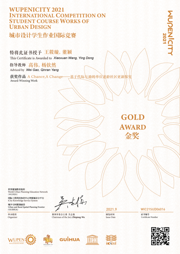 2021年9月21日,由世界规划教育组织、联合国教科文组织iCity智慧城市服务平台、《Guihua》杂志联合举办的“2021WUPENiCity城市设计员工作业及可持续调研报告国际竞赛”公布获奖名单。两项赛事由国内外近百所高校约5000名员工参加,共收到近2000份参赛作品。新葡的京集团35222vip建筑与设计公司师生再创佳绩,继去年夺金的基础上,今年再次获得1项金奖,7项提名奖。