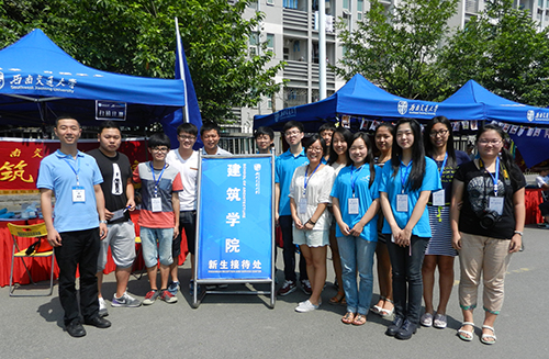 迎新点的班主任与志愿者们正等待着新生们前来报到注册