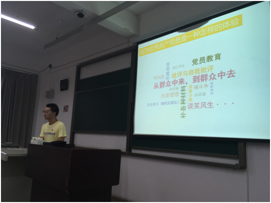 围绕会议主题,金宇航指出在座党员应该用党章党规规范党组织和党员行为,用习近平总书记系列重要讲话精神武装头脑、指导实践、推进工作,并且应融入日常、抓在经常。同时作为校级优秀党员,金宇航以自身崇高的党性修养为我们介绍了一个优秀党员及基层党支部书记应具备的品质,就解放思想、实事求是、爱国团结、无私奉献、勇于斗争、廉洁修身、信念坚定等几方面的品质作了深入阐述,结合自身平时的工作学习经历,为在座同学上了切实生动的一课,并就最近的时事政治等话题与在座党员进行了探讨。