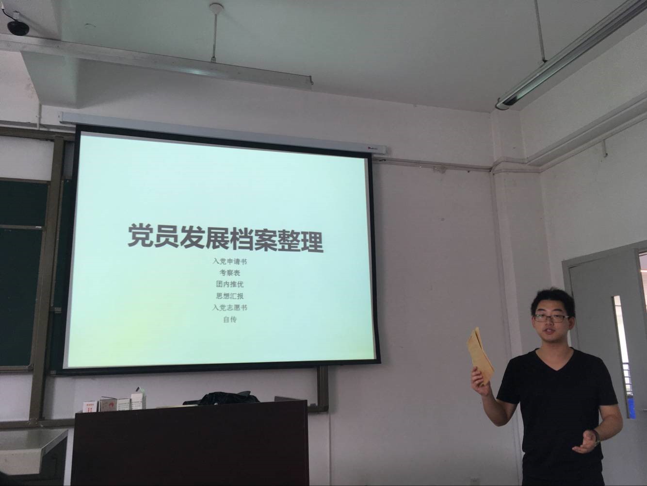 在本次支部会议上,针对近期发展党员较为集中的情况,金宇航同志对于支部内同学党员材料的整理与填写进行了详细介绍,并向参会同学具体介绍了党员材料的组成部分,入党积极分子考察人填写注意事项,以及入党志愿书、自传、党员发展对象推荐表、思想汇报等的填写要求。