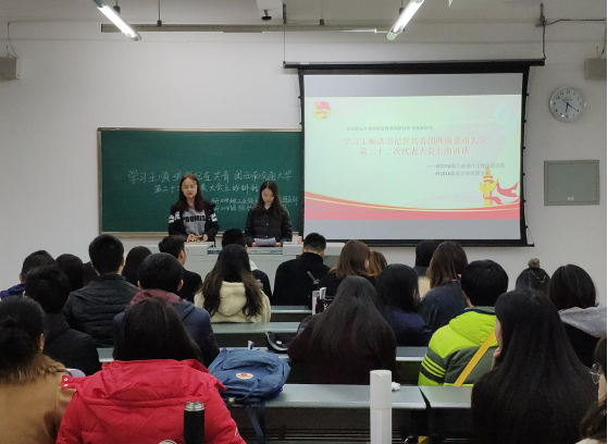 活动过程中,李钰和段沁妤同学针对两班基本情况对王顺洪书记在第二十二次代表大会上的讲话内容作了重点传达——王顺洪书记指出:过去五年,公司共青团工作稳步前进,成绩值得充分肯定,下一个五年,我们应当推进共青团工作再上新台阶,并对全校共青团员提出政治性、先进性、群众性三方面要求。李钰和段沁妤也对此向班级同学作出鼓励与鞭策,要求大家按照王顺洪书记对我们提出的期望与要求完善提升自己,要不忘初心、牢记使命,志存高远、德才并重、情理兼修、勇于开拓,保持和增强我们作为共青团员的政治性、先进性、群众性,做社会主义核心价值观的坚定信仰者、积极传播者、模范践行者,当好新时代公司党委的得力助手和后备军,为公司的改革、建设、发展、振兴、跨越贡献青春力量。同时,两位同学也分别对本班团支部今后的工作方向和目标作出指示:作为交大的一份子,要为公司的发展与复兴流汗出力,紧跟党组织,主动为党委分忧、为公司担当,而作为研究生的我们首要目标就是学好专业课知识,精勤求学,以更多的学术研究回报公司。
