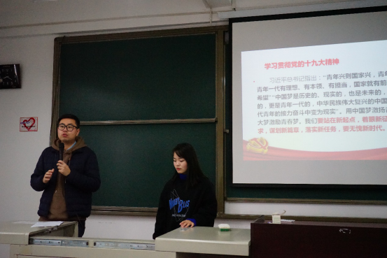 会上,团支书与团员们交流了自己学习十九大的感想。广大青年要勇做坚定者,坚持用习近平新时代中国特色社会主义思想武装头脑、指导行动。青年树立什么样的人生理想,选择什么样的奋斗方向,对于走好一生的路至关重要。历史已经充分表明,广大青年只有在中国共产党领导下,用党的科学理论构筑起强大精神支柱,坚定不移地走党带领人民开辟的中国道路,把个人奋斗融入祖国前途命运和民族复兴伟大梦想,才能最大限度地实现人生价值。