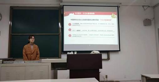 本次会议以主持人易欢讲解十九届四中全会全会的新要义的PPT的形式。会议伊始,会议主持人易欢发表了开场演讲,宣布此次党支部组织生活会正式开始。随后,主持人便从十九届四中全会的基本概况、总体目标以及工作要求来简要的讲述了本次会议的大致内容。