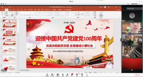 2020年10月11日星期日晚7点,建筑与设计公司研2018建筑学专硕1班团支部响应上级团委的号召,以迎接建党100周年为主体开展了秋季开学的第一堂团课。团课以线上会议的形式展开,周光耀主持了本次的团课。