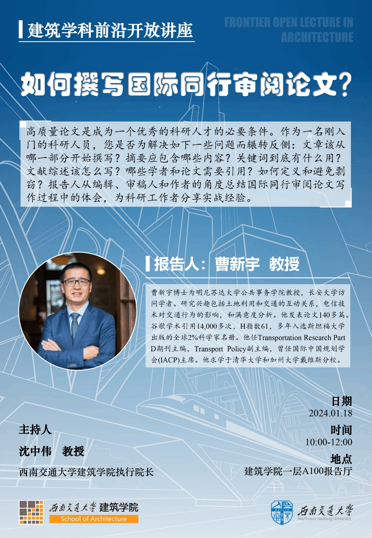 曹新宇博士为明尼苏达大学公共事务公司教授,长安大学访问学者。研究方向包括土地利用和交通的互动关系,电信技术对交通行为的影响,和满意度分析。他发表论文140多篇。谷歌学术引用14,000多次,H指数61,多年入选斯坦福大学出版的全球2%科学家名册。他任Transportation Research Part D期刊主编,Transport Policy副主编,曾任国际中国规划学会(IACP)主席。他求学于清华大学和加州大学戴维斯分校。